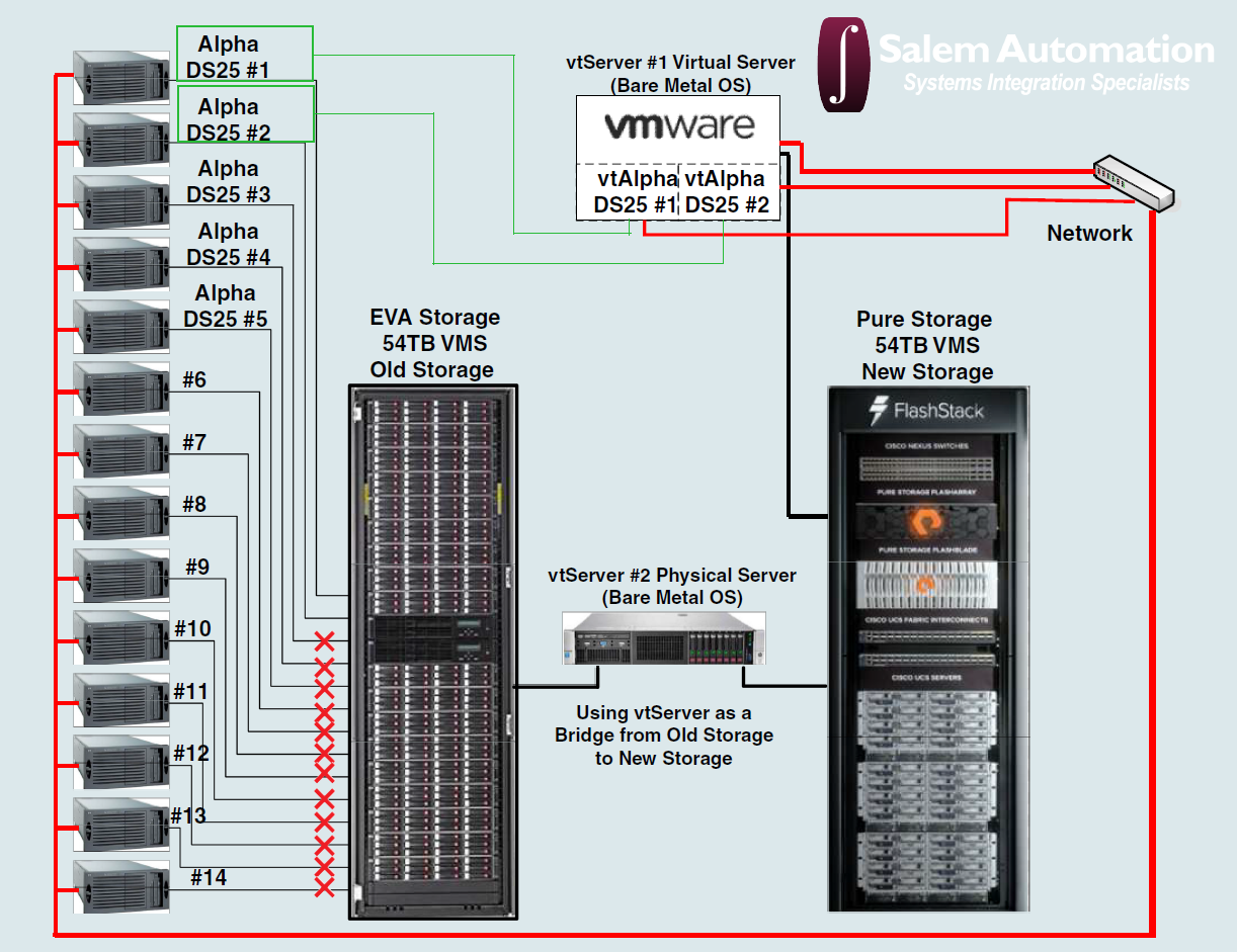 A vtServer provided connectivity between the new storage infrastructure and the existing Fibre Channel path. Salem orchestrated the migration of 100 TB of production data with zero data loss, leveraging OpenVMS cluster capabilities to maintain system availability throughout the process.